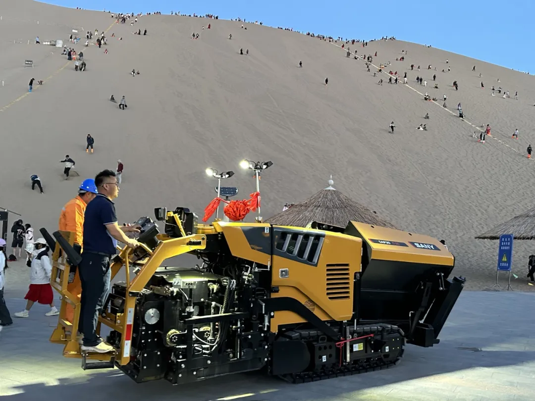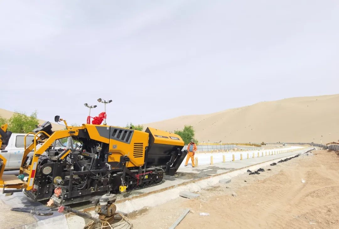 “大漠孤烟直,长河落日圆”,自旭日初升至星辉点点,三一SAP30C-10摊铺机便如同一位匠人,轰鸣着在月牙泉边的道路旁缓缓前行,为这片古老而神秘的土地抹上一抹现代色彩。