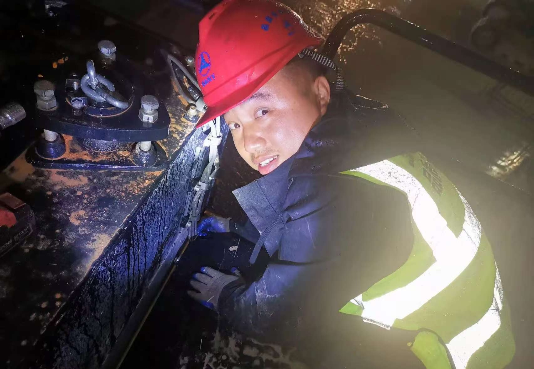 “客户着急,我们更着急。”李楫回忆道。他和团队成员迅速赶到现场,冒雨搭建起临时木方平台,安全带系在湿滑的钢梁上,雨水模糊了视线,但他们手中的工具操作却始终精准无误。经过十几个小时的抢修,设备终于恢复正常,客户紧锁的眉头终于舒展,竖起大拇指:“三一嘅服务真係得!”