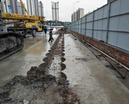 施工工艺:修筑导墙、选择钻斗和套管、利用旋挖钻机动力头对套管施加扭矩及向下压力,将护筒下入淤泥中,直至护筒上端高出地面 0.5~1m,然后断开套管与驱动花筒的连接,边超前钻进边继续对接下一节套管,直至设计深度,灌注混凝土、拔出套管。
