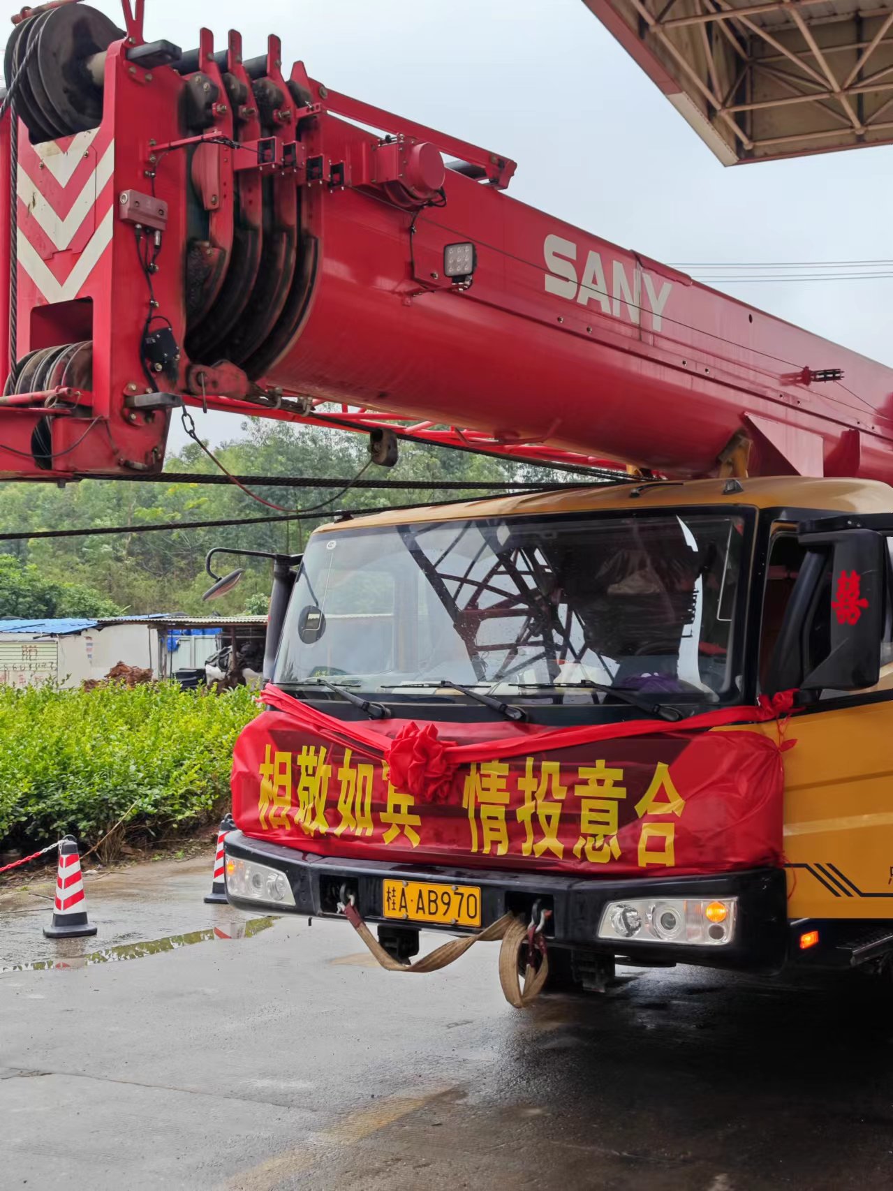 据新郎黎先生介绍,知道自己要用三一起重机迎亲后,当地的丰景吊装公司、横州长信公司、林记吊装公司也出动了自家的吊车前来帮忙,将吊车冲洗干净,贴上喜字、挂上红花和横幅。