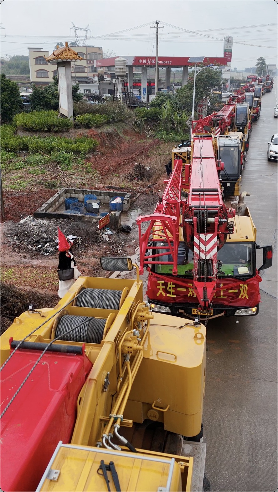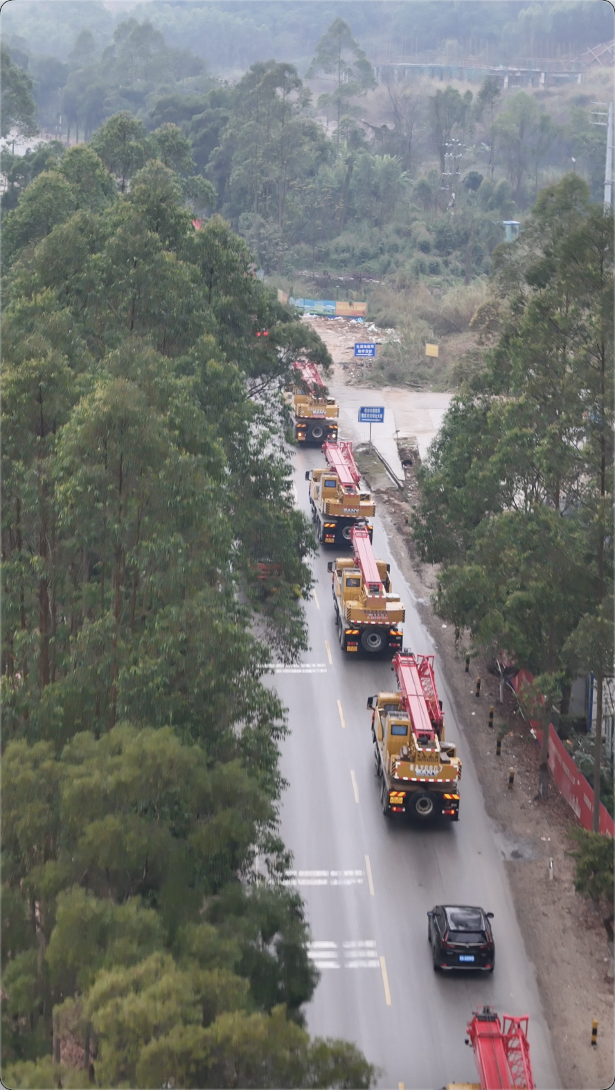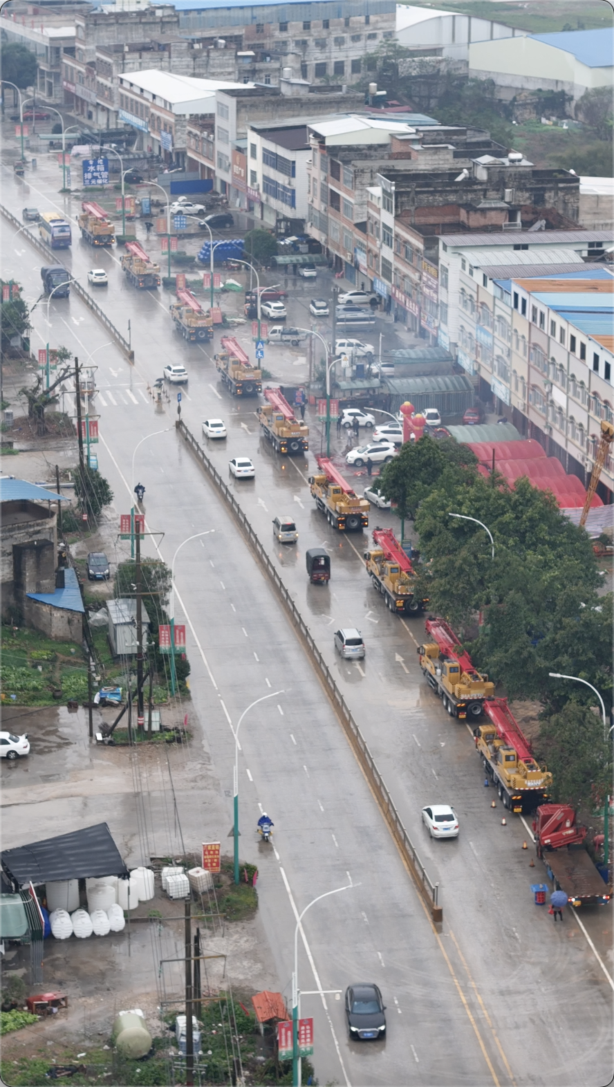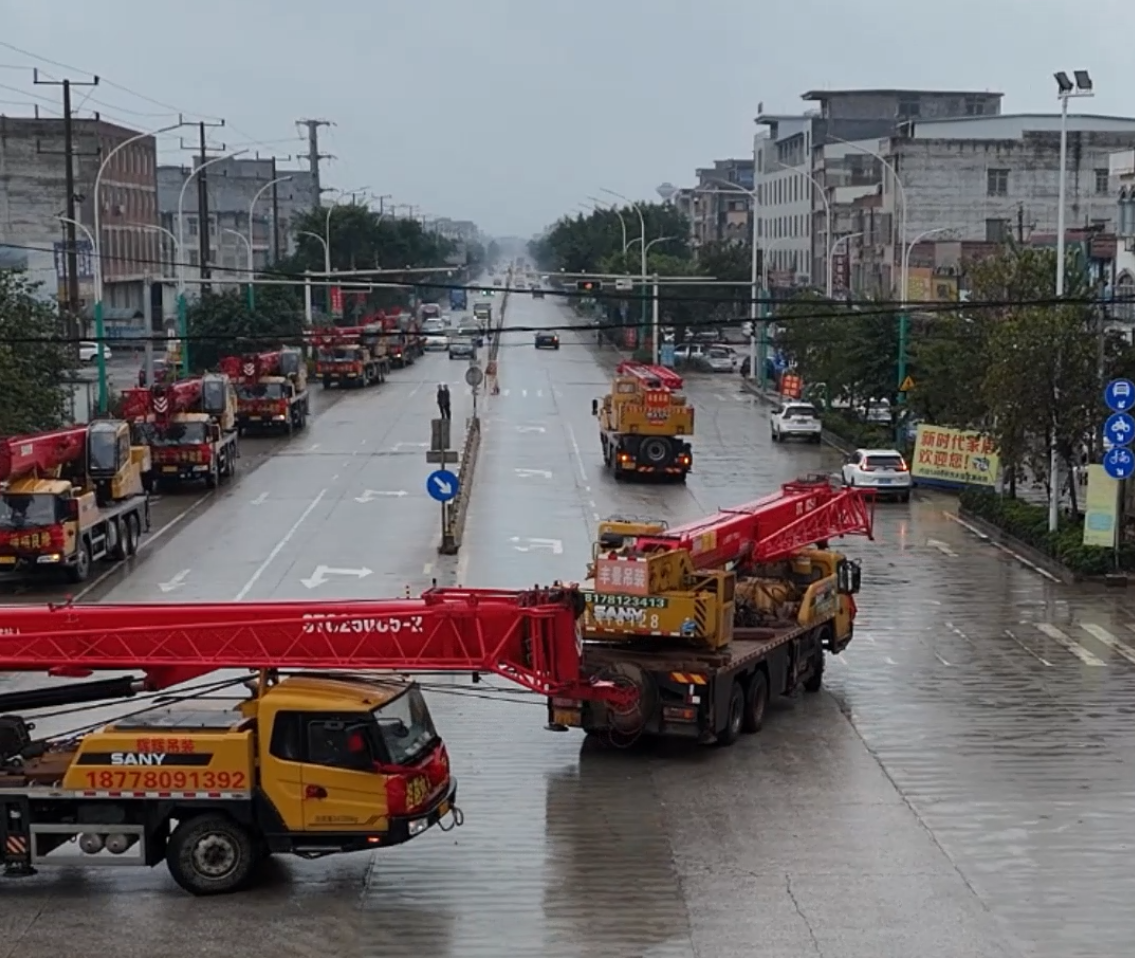 近日,广西横州县的街头上出现了一列特别的车队:9台三一起重机一字排开,车头装点着醒目的大红花,既喜庆又霸气。原来,这道独特的风景线,是广西横县辉辉吊装公司的老板黎遗辉的迎亲队伍。