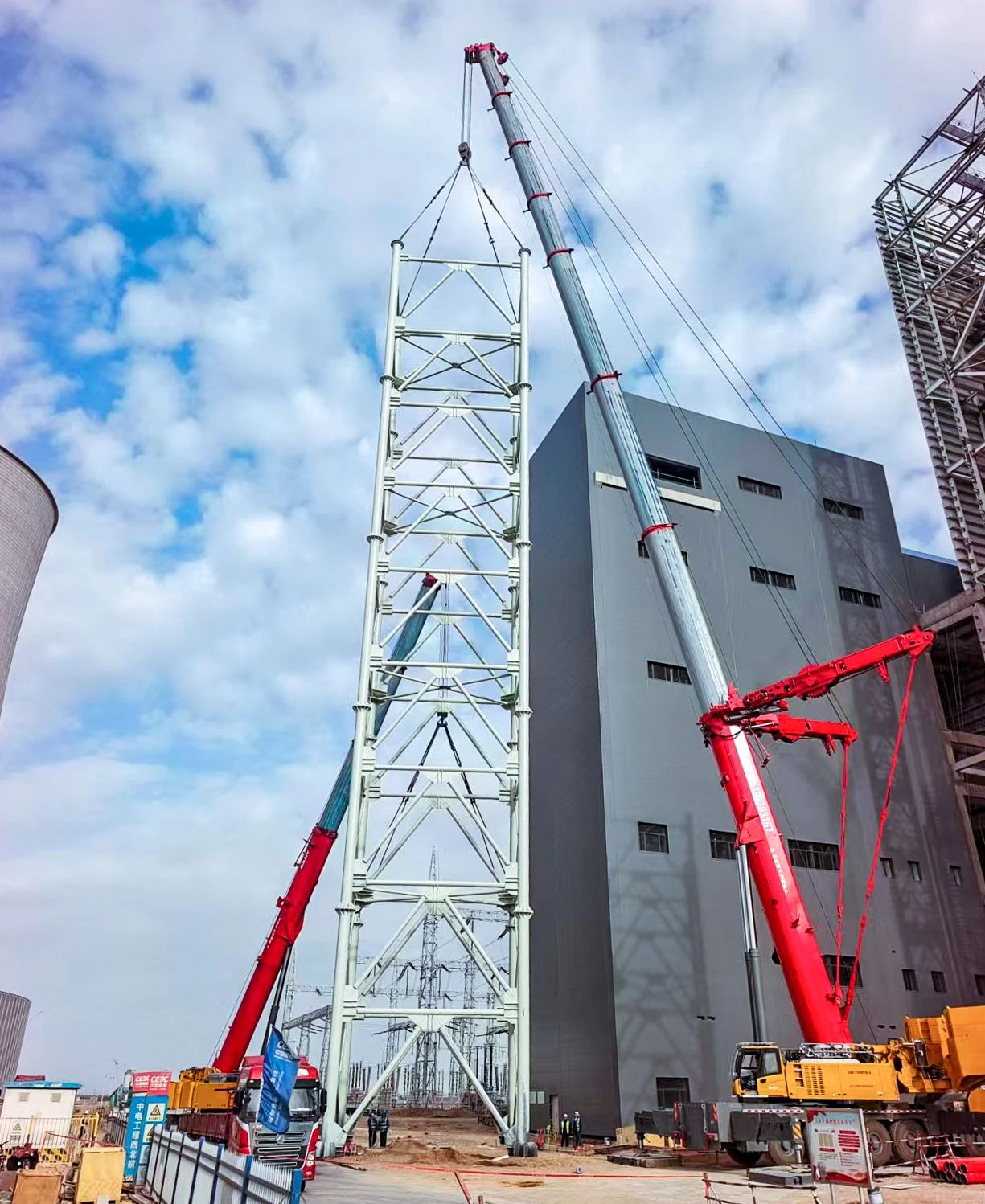 >>> 单机吊装,独当一面 在甘肃酒泉市瓜州常乐电厂,采用68.2米主臂,93吨配重,将重达82吨钢构轻松吊装到指定位置。
