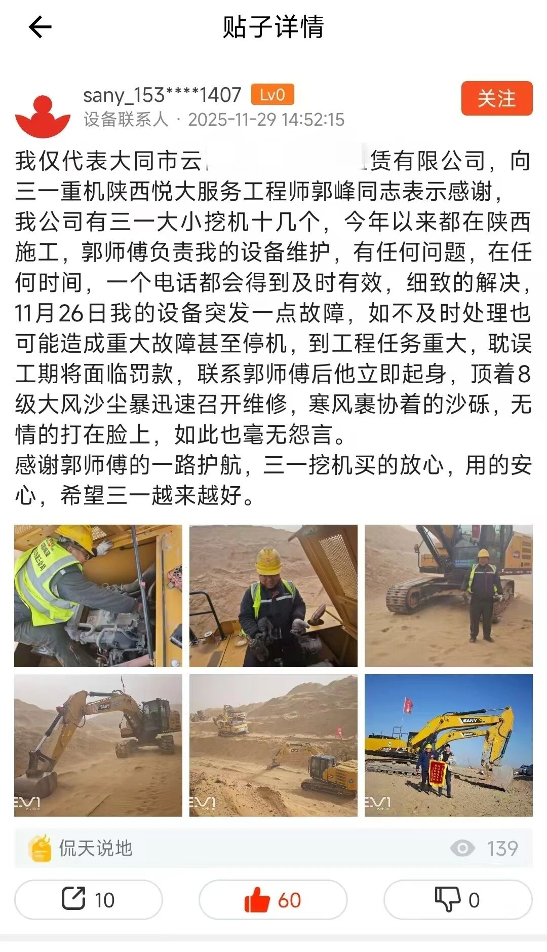 返程时,风沙依旧未停。郭峰的身影在昏黄天地间格外坚定。他用快速响应诠释责任,用专业技术化解危机,在极端环境中践行了三一售后 “随叫随到、为客户分忧” 的初心,用实际行动为三一服务品牌增添了最耀眼的光彩。