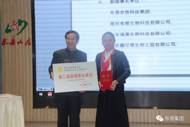 2019年1月11-12日,山東畜牧獸醫學會動物微生态學專業委員會學術研讨會暨“福喜杯”畜禽産品安全生産高峰論壇在泰安東嶽山莊勝利召開。來自山東省動物微生态行業以及飼料養殖企業的代表共計200多人參加了本次論壇,布恩集團于娟董事長受邀出席此次論壇。