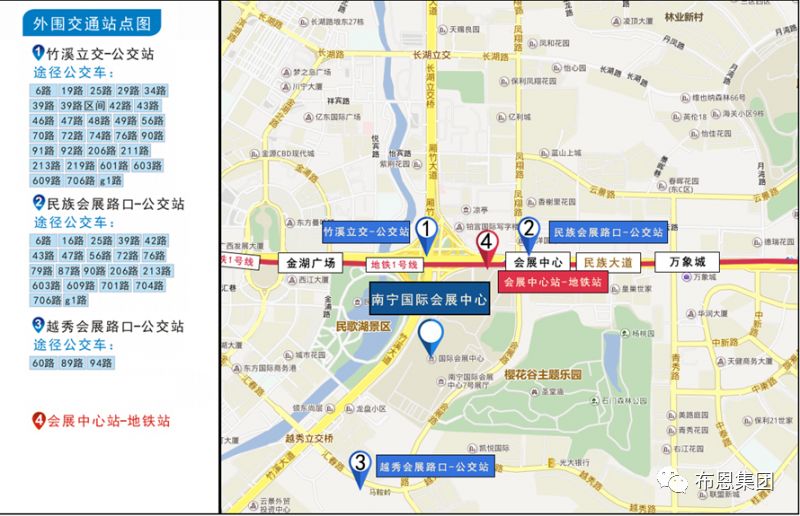 1. 公交車線路:6路,全程約9公裡。車站蘇州路公交站乘坐6路,經過13站, 到達竹溪立交站。步行約300米到達南甯國際會展中心;