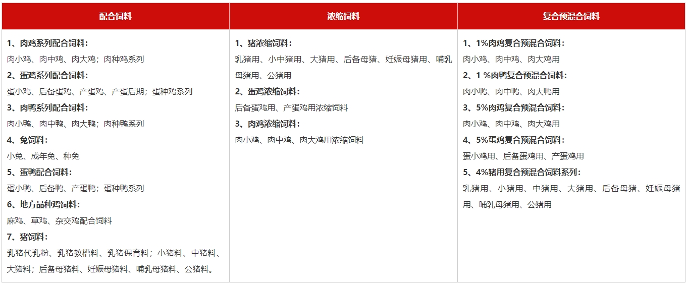 主營業務為研發、生産、銷售各類全價配合飼料、預混合飼料、濃縮飼料,主要産品包括:鴨、雞、豬、水産等幾大類。各類飼料又根據動物品種、生長階段、産品性态等的不同設計不同的配方,生産符合不同區域、不同生長階段的各種專用飼料。