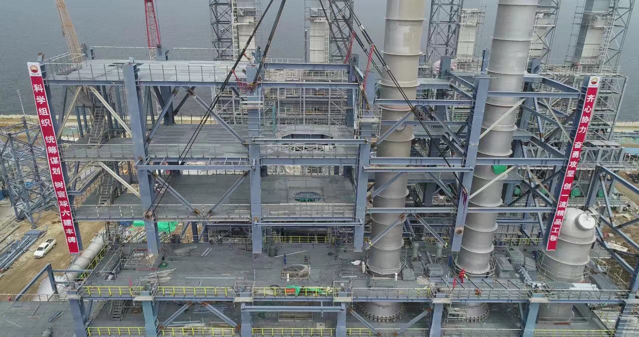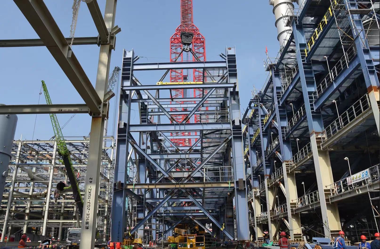反再框架模块全装安装完成后,总体高度达95米,将成为裕龙石化炼油项目标志性框架结构。