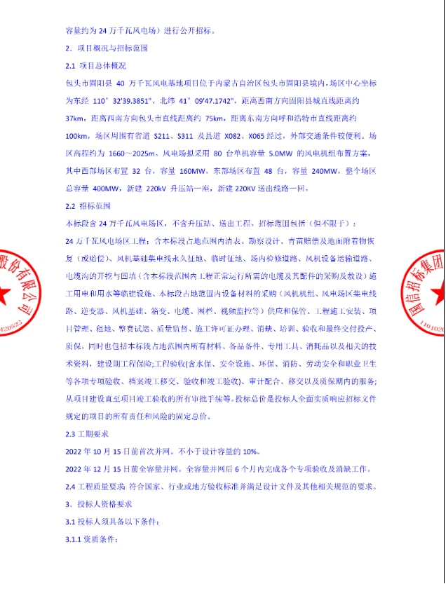 近日,包头市固阳县40万千瓦风电基地项目(标段一)EPC招标公告发布。根据公告,包头市固阳县40万千瓦风电基地项目位于内蒙古自治区包头市固阳县境内。风电场拟采用80台单机容量5.0MW的风电机组布置方案,其中西部场区布置32台,容量160MW,东部场区布置48台,容量240MW,整个场区总容量400MW,新建220kV升压站一座,新建220KV送出线路一回。