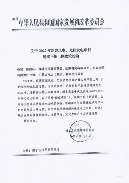 关于2022年新建风电、光伏发电项目延续平价上网政策的函