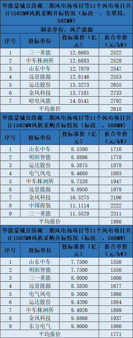 华能1.5GW风电项目开标,三一重能等9家整机商竞标,最低报价1550元/kW!