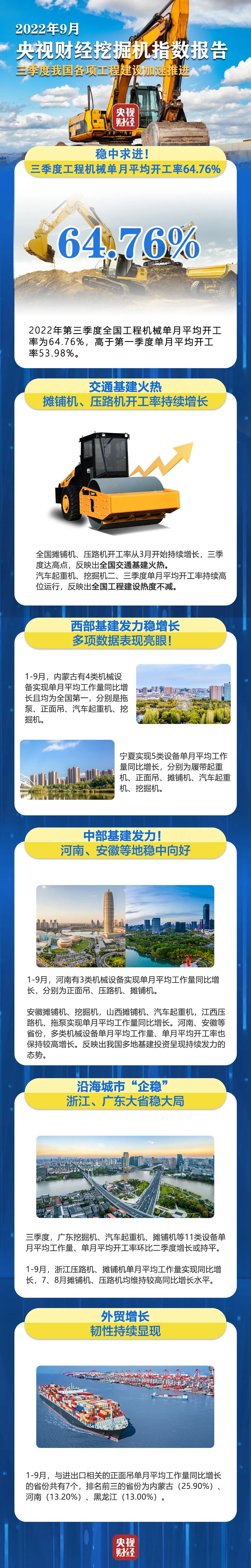 挖掘机是基础设施建设的“标配”,是反映基础设施建设、观察固定资产投资等经济变化的风向标。央视财经与三一重工、树根互联联合打造的“央视财经挖掘机指数”发布了最新相关数据。今年1至9月,我国各项基础设施投资加速推进,多类机械设备开工率维持高位。