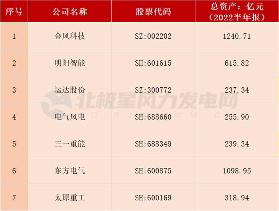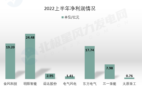 从2022上半年营业收入看,金风科技、明阳智能、东方电气(含其其他电源板块收入)保持在百亿以上;明阳智能、运达股份、东方电气、三一重能、太原重工营业收入稳步增长。