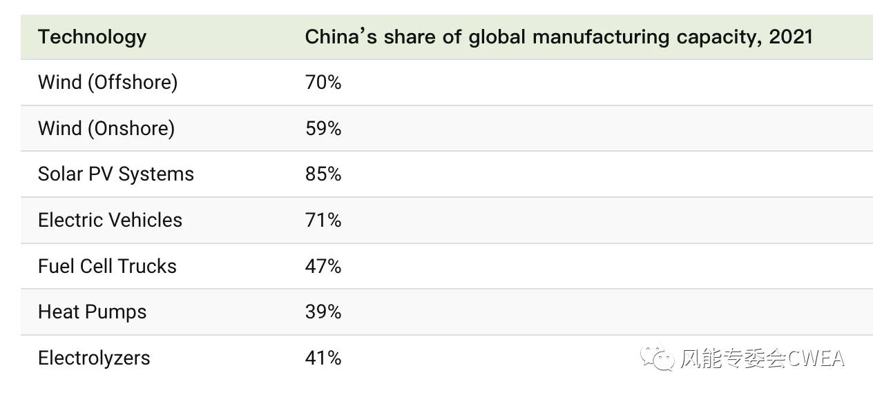 2021年中国在全球清洁能源技术制造产能中所占的份额分布: