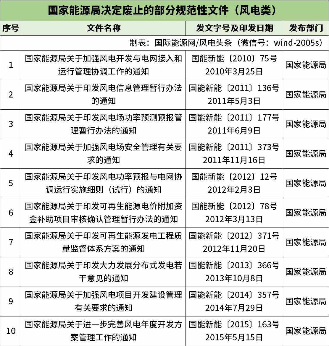 国家能源局决定废止10份风电规范性文件。分别是《国家能源局关于加强风电开发与电网接入和运行管理协调工作的通知》、《国家能源局关于印发风电信息管理暂行办法的通知》、《国家能源局关于印发风电场功率预测预报管理暂行办法的通知》、《国家能源局关于加强风电场安全管理有关要求的通知》、《国家能源局关于印发风电功率预报与电网协调运行实施细则(试行)的通知》、《国家能源局关于印发可再生能源电价附加资金补助项目审核确认管理暂行办法的通知》、《国家能源局关于印发可再生能源发电工程质量监督体系方案的通知》、《国家能源局关于印发大力发展分布式发电若干意见的通知》、《国家能源局关于加强风电项目开发建设管理有关要求的通知》、《国家能源局关于进一步完善风电年度开发方案管理工作的通知》。