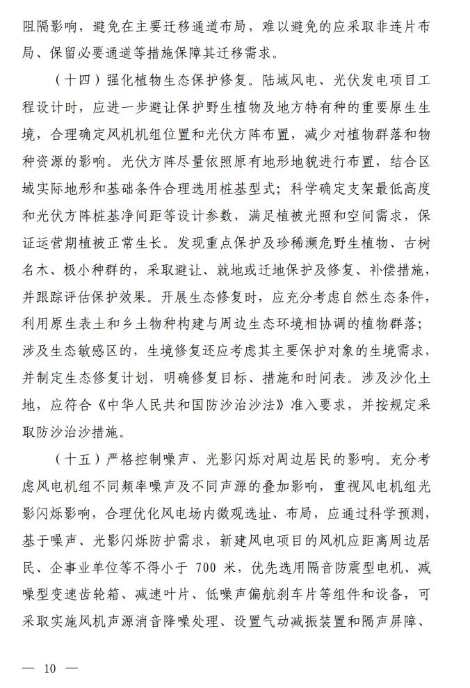其中,在严格落实项目生态环境保护措施及要求方面明确,严格控制噪声、光影闪烁对周边居民的影响。充分考虑风电机组不同频率噪声及不同声源的叠加影响,重视风电机组光 影闪烁影响,合理优化风电场内微观选址、布局,应通过科学预测, 基于噪声、光影闪烁防护需求,新建风电项目的风机应距离周边居民、企事业单位等不得小于700米。