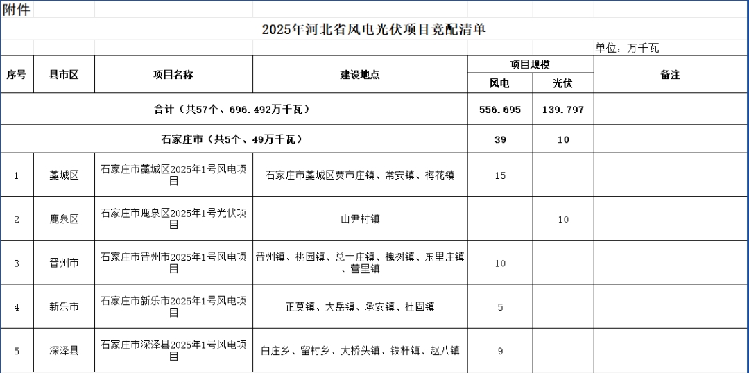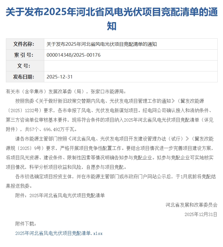 北极星风力发电网获悉,2025年12月31日,河北省发改委发布《关于发布2025年河北省风电光伏项目竞配清单的通知》。《通知》中指出,纳入2025年河北省风电光伏项目竞配清单的符合条件的项目共57个,总装机容量696.492万千瓦。其中,风电项目40个,规模共计556.695万千瓦;光伏项目17个,规模共计139.797万千瓦。详情见下: