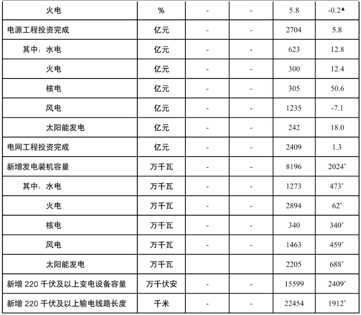 注:1.全社会用电量为全口径数据,全国供电量为调度口径数据。2.“同比增长”列中,标*的指标为绝对量;标▲的指标为百分点。