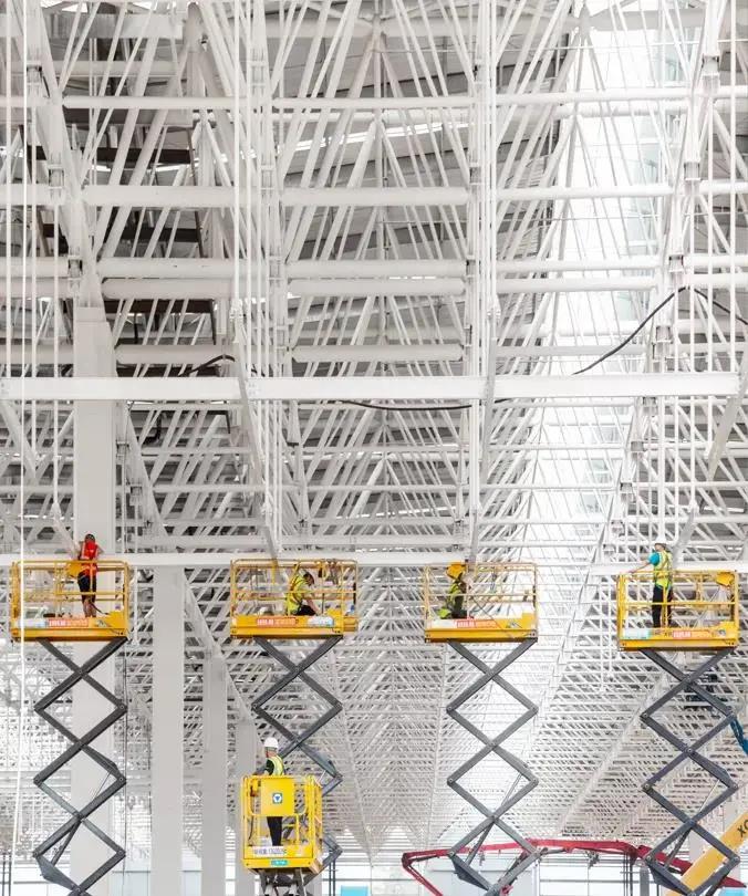 记者了解到,过去一年中,B地块项目工作量最大的建设任务是钢结构立柱和顶部网架结构的安装,最繁忙时,现场施工人员超过2000人。