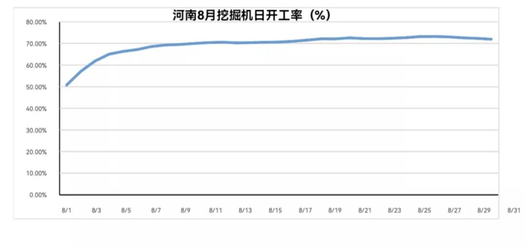 其中,值得注意的是,自7月下旬河南水灾发生以来,挖掘机在救援期间以及善后工作中都发挥了重要作用,成为当地开挖排水渠、修筑防洪堤坝的主力军。央视财经挖掘机指数显示,河南挖掘机开工率水平整个八月份始终保持在70%左右的高位。