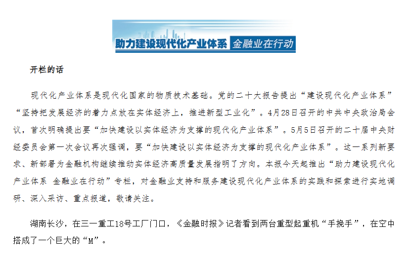 近日,由中国人民银行牵头,中央广播电视总台、经济日报、人民网、中新社、上海证券报、中国证券报、中国金融等十余家中央媒体组团走进三一,开展实地采访活动,深入了解金融浇灌高端制造业产业集群的显著成效,集中报道三一在金融支持下,不断推动先进制造业高质量发展。