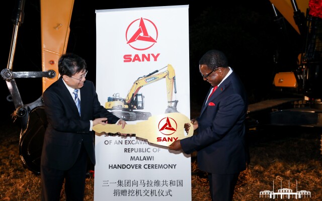 (9月11日下午,马拉维总统府,副省长、省公安厅厅长王一鸥向查克维拉总统交付三一集团捐赠的挖掘机。通讯员 摄)