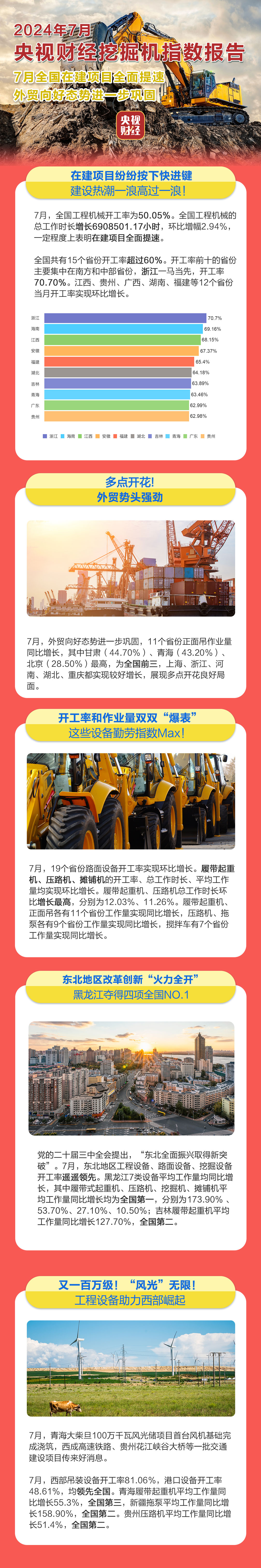 挖掘机是基础设施建设的“标配”,是反映基础设施建设、观察固定资产投资等经济变化的风向标。央视财经与三一重工、树根互联联合打造的“央视财经挖掘机指数”今天发布了最新相关数据。7月,我国在建项目全面提速,道路交通等大型基建进展顺利。外贸向好势头得到进一步巩固,多地港口设备开工“火热”,展现多点开花良好局面。
