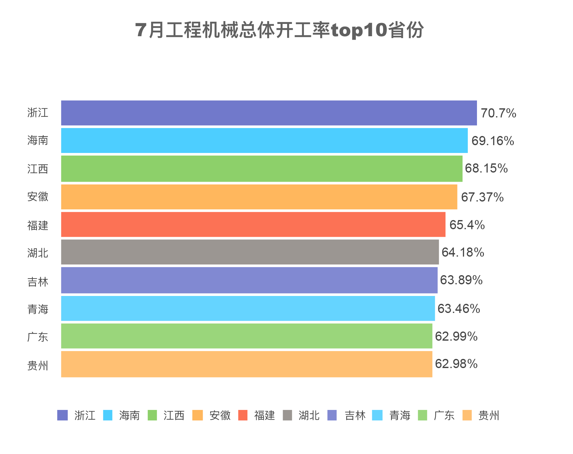 全国共有15个省份开工率超过60%。开工率前十的省份主要集中在南方和中部省份,浙江一马当先,开工率70.70%。