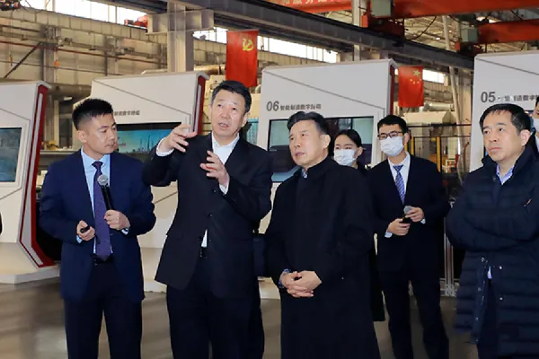王诚一行首先参观了全球行业首家灯塔工厂——桩机1号工厂,深入了解三一C端互联、设备互联、三现数据等数字化应用,重点考察了智能化柔性焊接、机器视觉+工业机器人等场景。