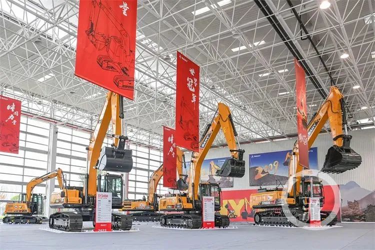 挖掘机组装下线,由众多的配套部件集成。