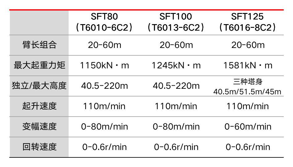 首批推出的C系列二代产品SFT80(T6010-6C2)、SFT100(T6013-6C2)、SFT125(T6016-8C5)平头塔机,是PC房建、桥梁、钢构吊装的新型利器。