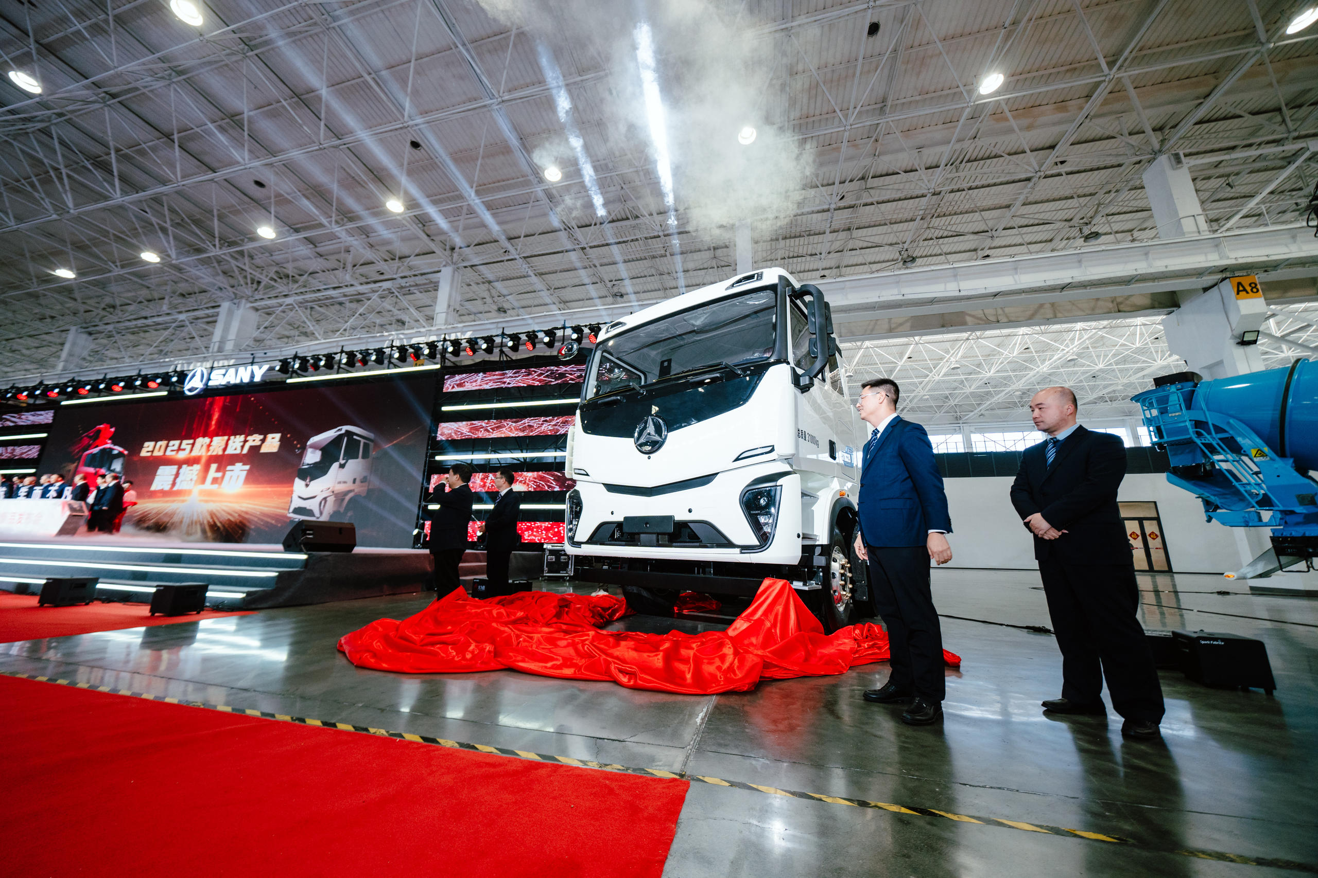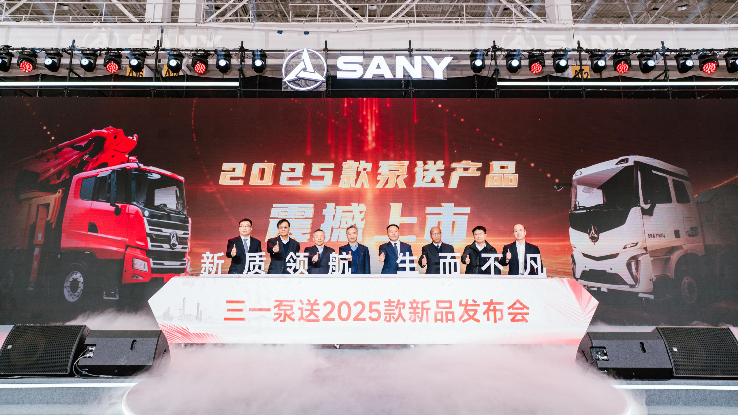 在万众期待中,三一泵路事业部董事长蒋庆彬,中国混凝土与水泥制品协会执行会长吴文贵,三一集团研发管理总部总监刘魁,中国混凝土与水泥制品协会荣誉会长徐永模、特别副会长王肇嘉,以及三一泵路事业部副总工程师张克军、营销总经理王伟、泵送公司总经理陈添明等人共同为三一泵路事业部2025款新产品揭幕。
