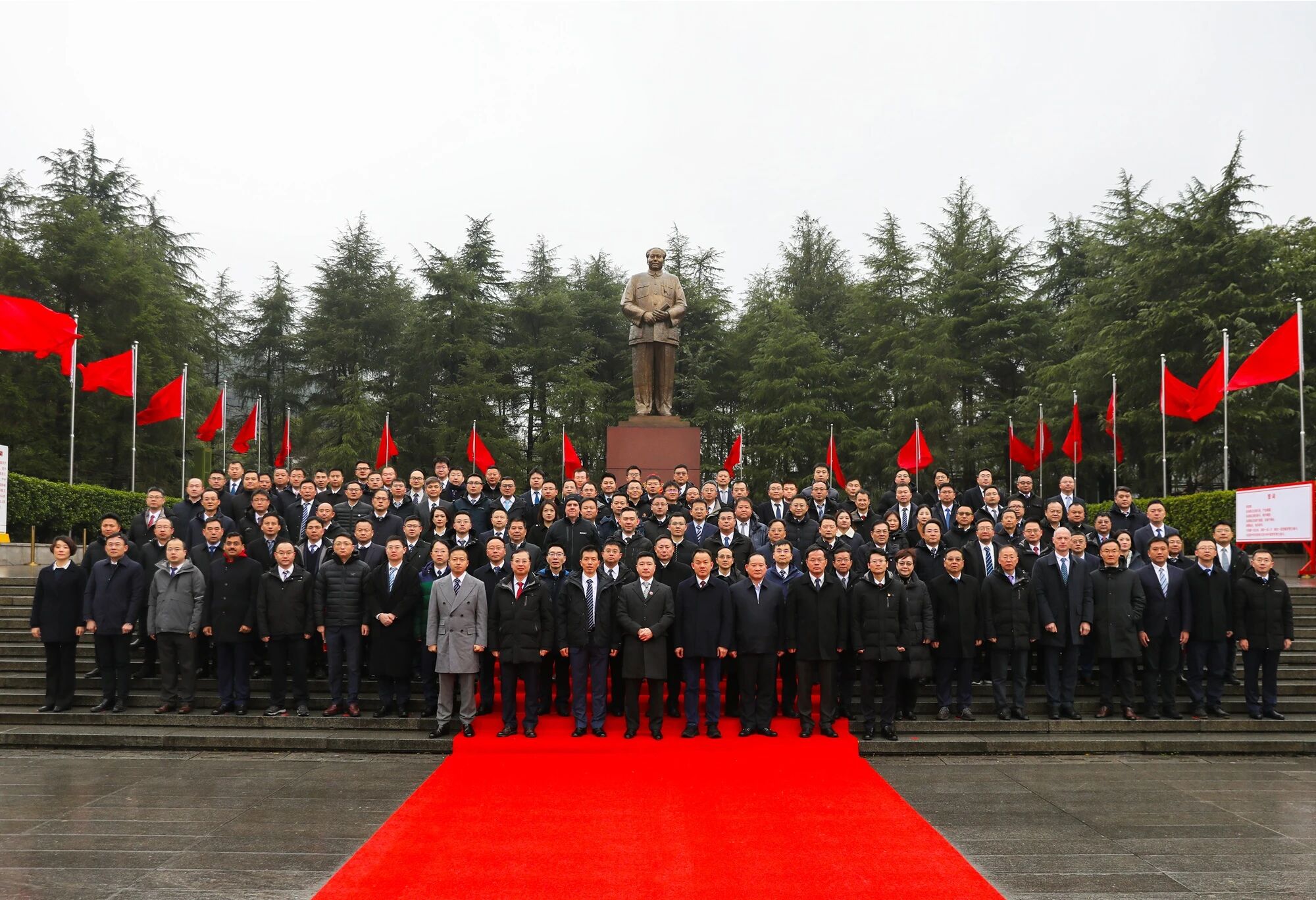 庄严的铜像广场上,松柏苍翠。随着《献花曲》缓缓奏响,全体高管列队肃立,缓步上前,向一代伟人敬献花篮,并深深三鞠躬,寄托无尽缅怀与深切崇敬。
