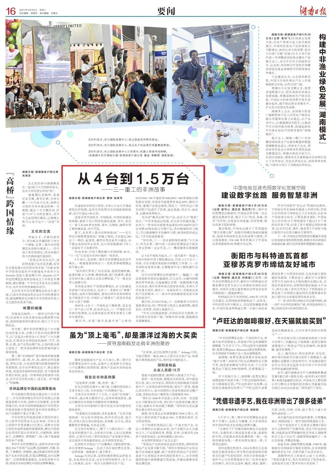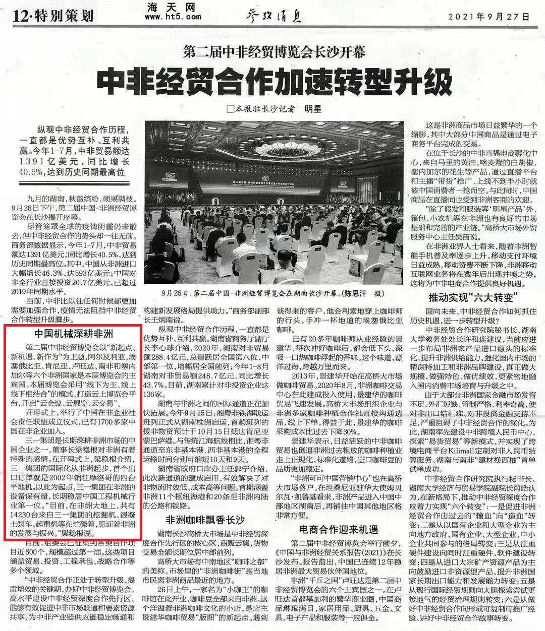 在湖南日报报道中,三一不仅是博览会中一道独具特色的风景,更是闪耀非洲的中国红,充分展现出“中国制造”深度参与非洲建设、与非洲共荣共发展的良好形象。