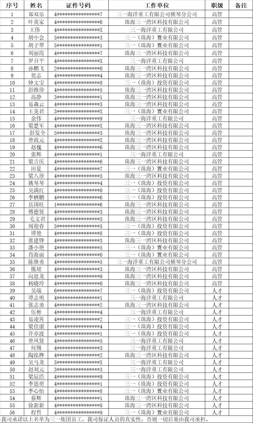 为增加员工归属感,我司开发位于珠海市金湾区平沙镇铭恩路31号【三一蓝海花园项目】用于引进行业人才,为保障房住不炒的居住用途及员工购房资格合规性,根据我司制定的《关于三一蓝海花园购房资格管理办法》,现对购房名单做如下公示: