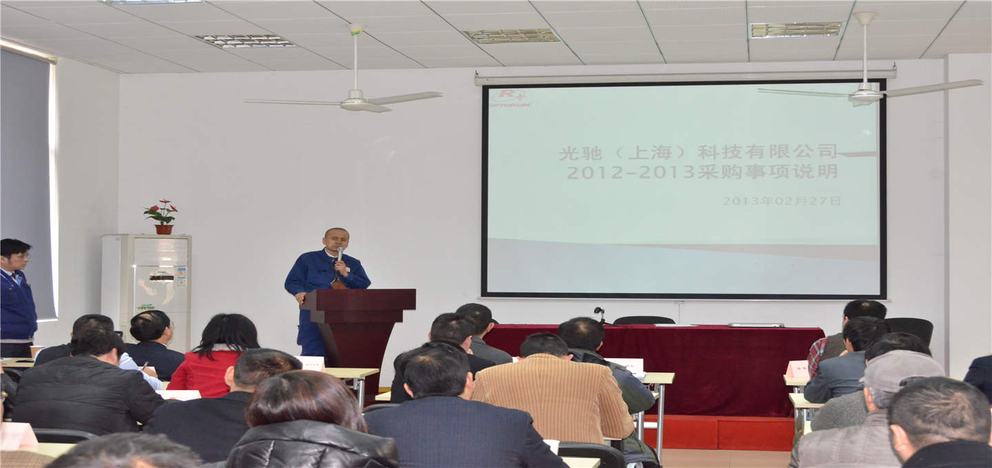 我司于2013年3月2日下午13:30在明鸿培训中心举办了2013年度光驰科技(上海)有限公司供应商大会。会议在热烈的掌声中开始,在主持人简单介绍参会公司领导与参会来宾后,林为平总经理做了关于《共进 共赢 共创未来》的主题演讲:对光驰科技(上海)有限公司的发展历程作了回顾,并对公司的产品与用途领域、市场占有率、品质、采购体系进行了详尽的介绍,同时对2013年的企业发展目标与战略作出了相关指示。与会来宾对OPTORUN的发展与产品有了一定的了解,充分认识到OPTORUN在业界的发展成就与成果。