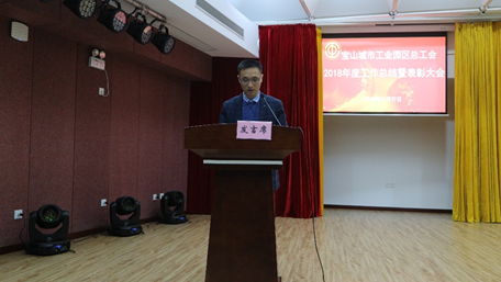 2018年12月27日下午,宝山城市工业园区总工会2018年度工作总结暨表彰大会在园区大厦六楼报告厅顺利召开。园区党工委书记周健德、园区总工会主席杨爱丽、园区党工委副书记葛茂华以及园区基层工会主席、工会干部等80余人参加了此次会议。会议由园区党工委副书记葛茂华主持。