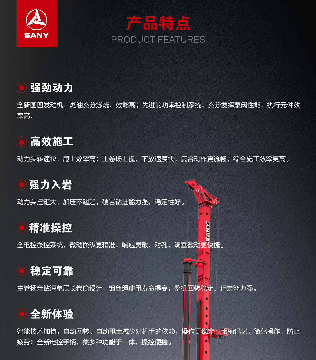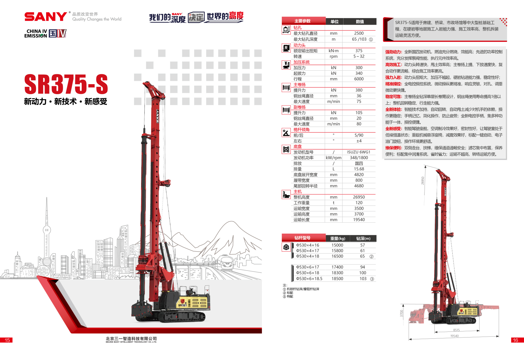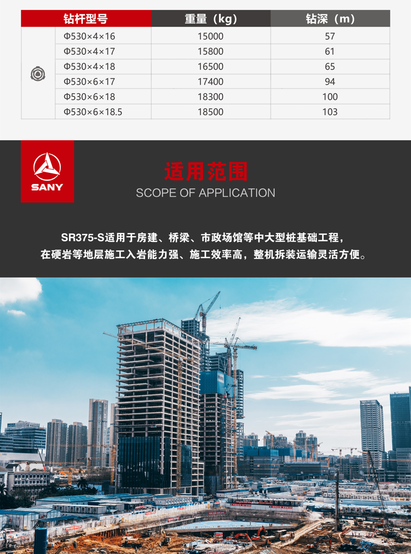 SR375-S适用于房建、桥梁、市政场馆等中大型桩基础工 程,在硬岩等地层施工入岩能力强、施工效率高,整机拆装运输灵活方便。