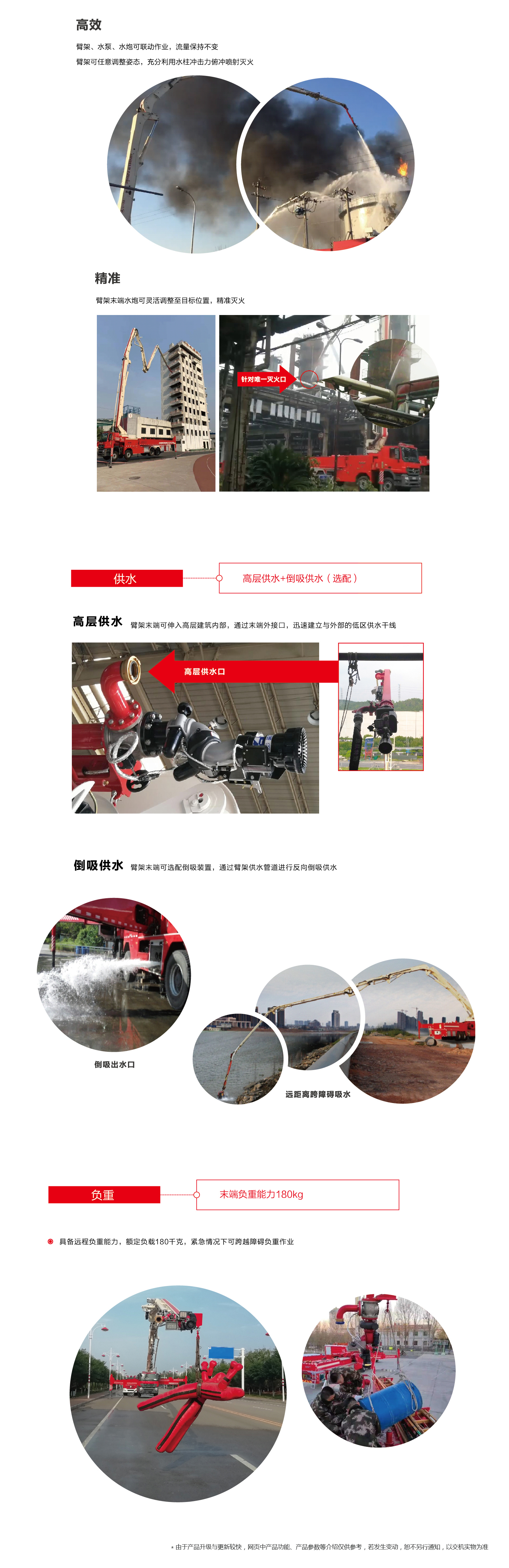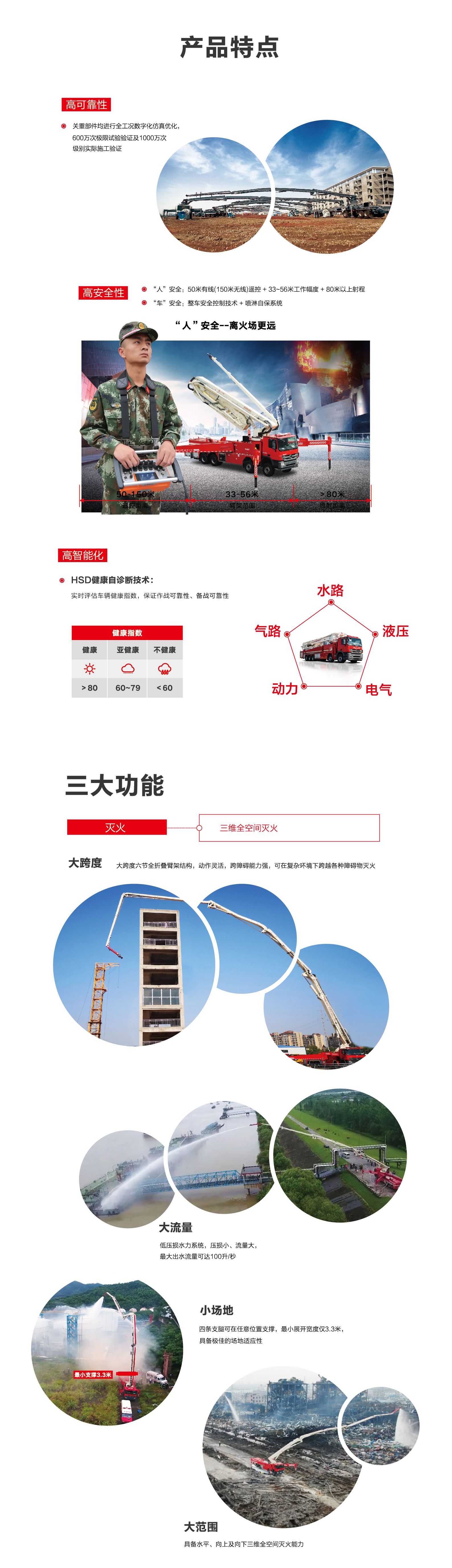 48m大跨度举高喷射消防车,与北京消防总队联合开发,填补了行业空白,可有效用于大跨空间建筑(如大型城市综合体、机场高铁候机(车)厅、仓库厂房、文体场馆及石化储罐等)火灾事故处置。整车具备水平跨度大,跨障能力强,精准灭火;任意支撑专利技术,支腿支撑占地小;臂架水炮联动操作;实时火场视频监控;50米有线遥控及150米无线遥控;180公斤负重救援;高层供水等功能