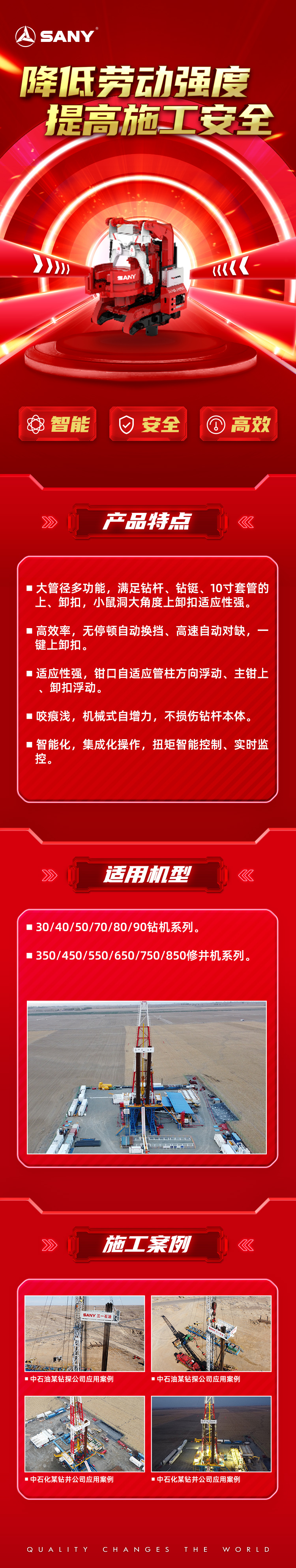 高效率、无停顿自动换挡、高速自动对缺、一键上卸扣。