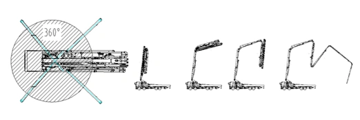 臂架可±360°全方位趴平施工,施工范围广; 6RZR臂架折叠方式,臂架收展迅速; 臂架最小展开高度低,场地适应能力强; 末节臂架可180°反勾施工,布料灵活。