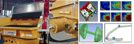 复杂工况臂架有限元分析,50万方或者使用8年以上不开裂; 整机疲劳试验场、六自由度结构件疲劳试验台,600万次以上疲劳试验,结构可靠。